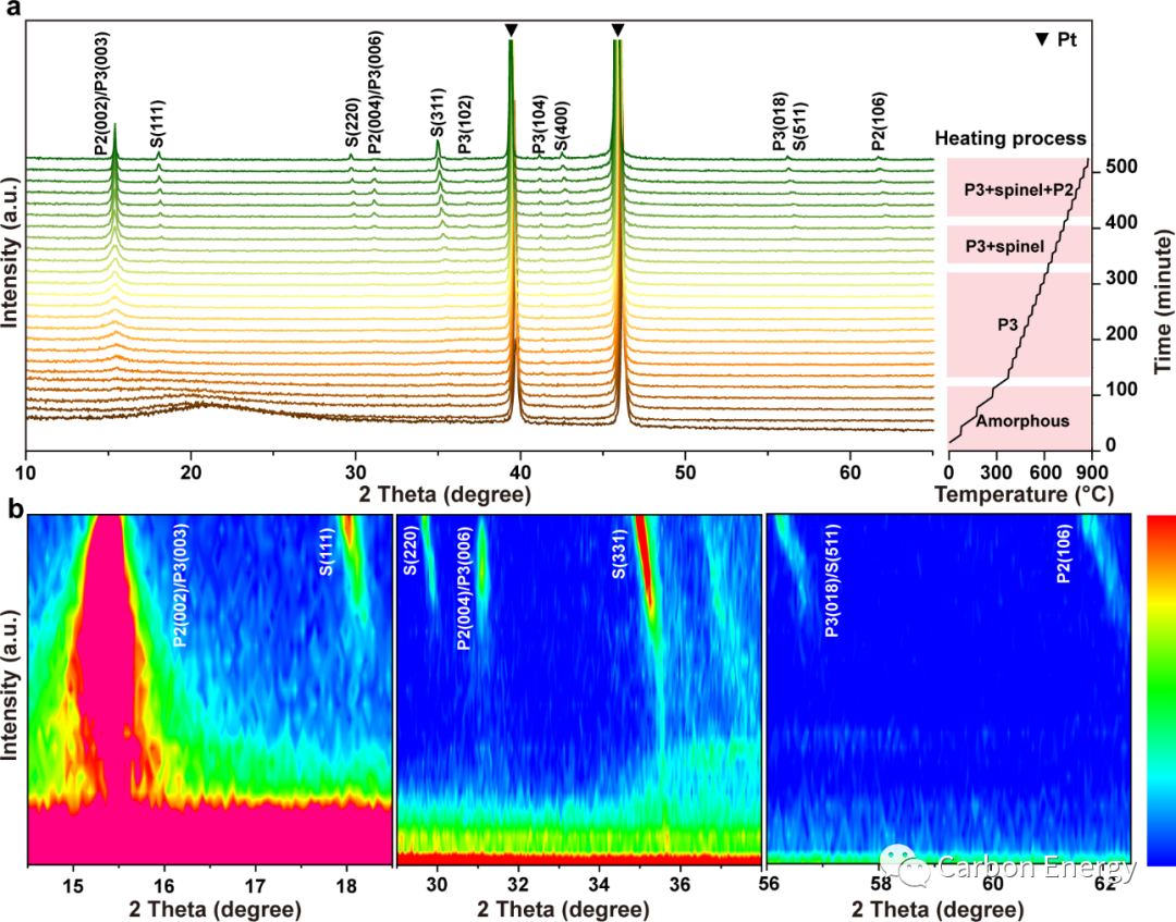 图1:煅烧过程中的结构转化。a) P2/P3@spinel-NaNCM正极材料前驱体煅烧过程中不同温度的原位高温XRD图谱。b)原位高温XRD二维图。