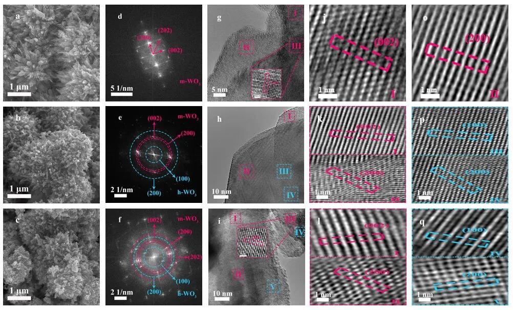 图2.(a)WO3-1样品的SEM图、(d)FFT图谱及(g, j, o)HRTEM图;(b)WO3-2样品的SEM图、(e)FFT图谱及(h, k, p)HRTEM图;(c)WO3-3样品的SEM图、(f)FFT图谱及(i, l, q)HRTEM图。