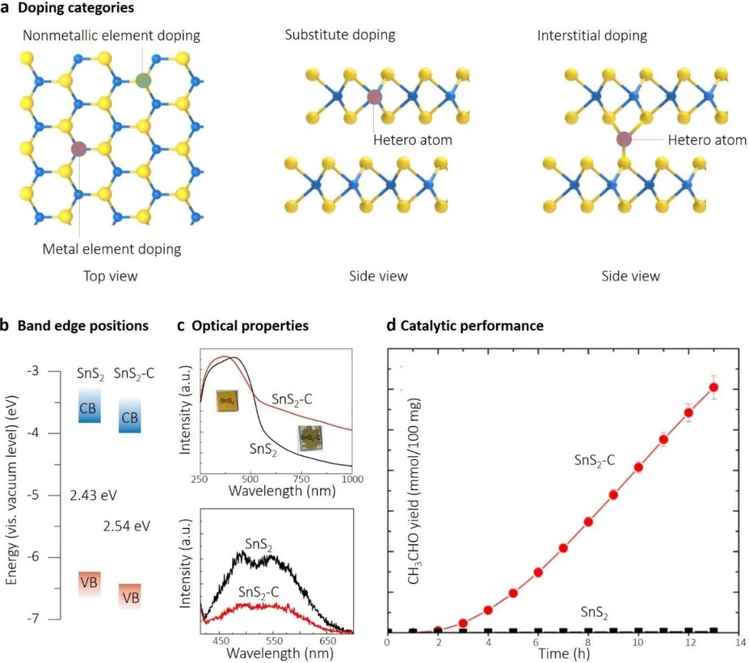 将杂原子引入半导体2D TMD可以有效地改变其光电性能(例如,有效地增强光吸收并延长载流子寿命),从而提高其光催化性能。创建空位也是一种普遍的策略,以释放2D TMD在光催化性能改善方面的巨大潜力。这是因为它可以调整2D TMD的电子结构和相邻原子排列,以提高固有活性。此外,作为载流子阱,它也有利于分离光生电子和空穴,延长其寿命,从而提高光催化性能。