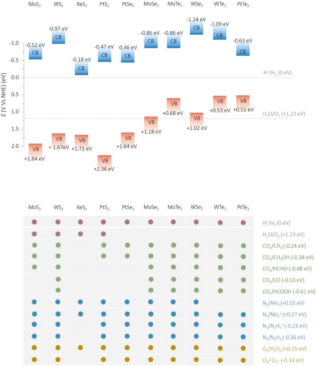 图10 | 2D TMDs的合适的能带位置和一些常见光催化反应的氧化还原电势。