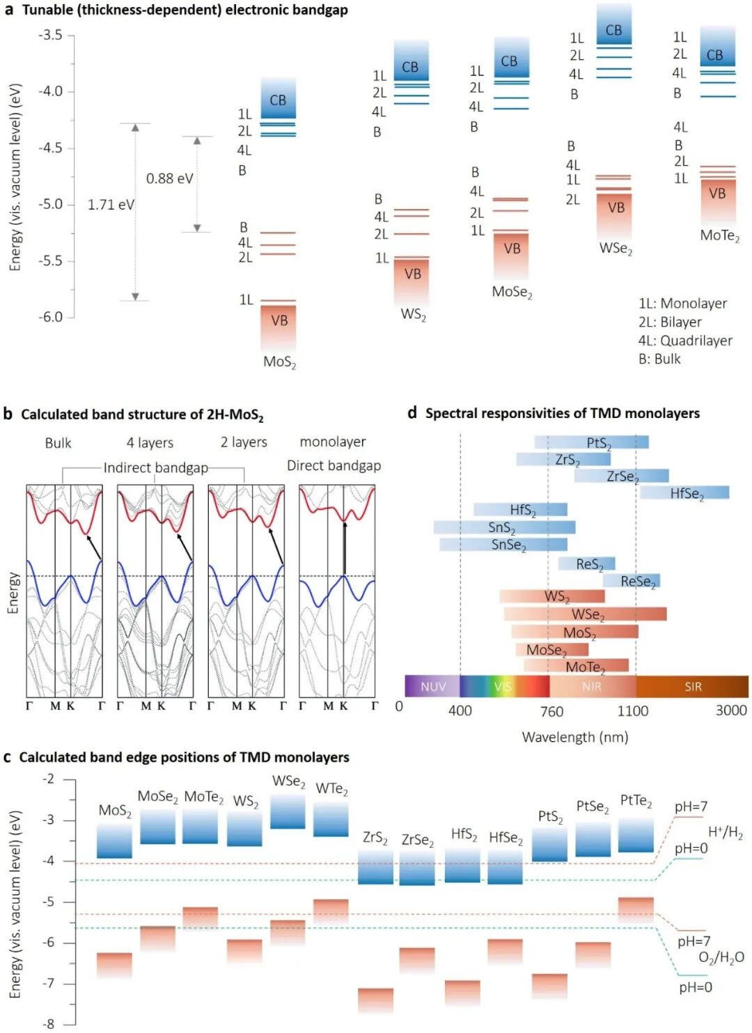 半导体相2D TMD(例如2H-MoS2)是活性光催化剂(光收集材料)的潜在候选者。它们作为活性光催化剂的优势包括:窄带隙(通常小于2.4eV,例如MoS2单层的2.16eV),合适的能带位置,原子薄的属性,作为光催化基础研究的理想平台等。