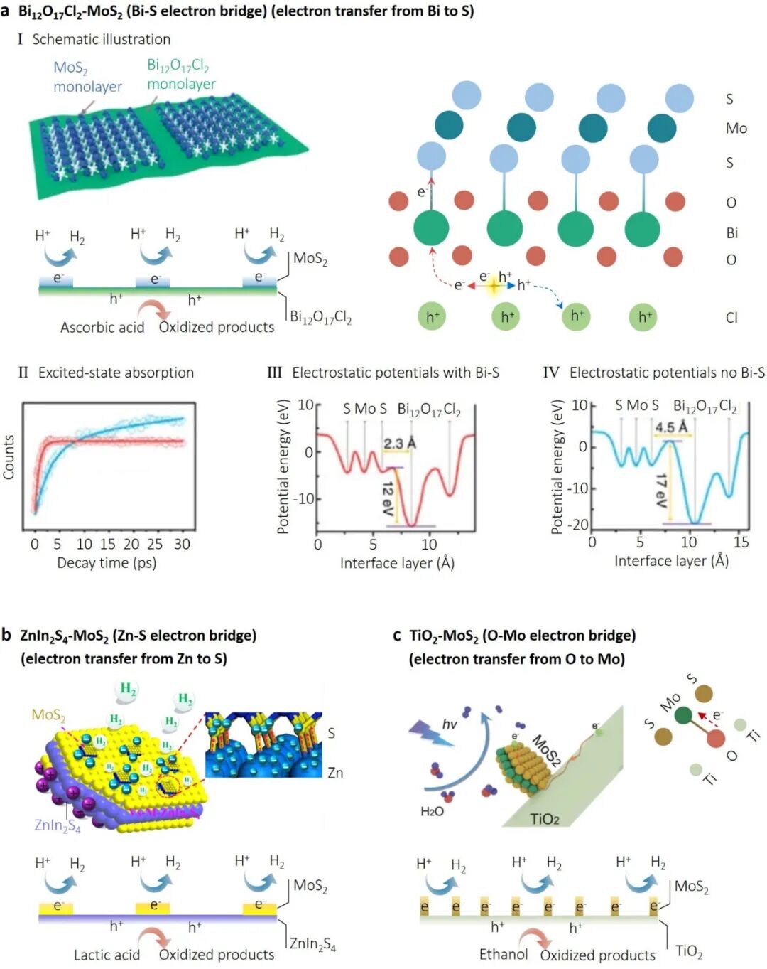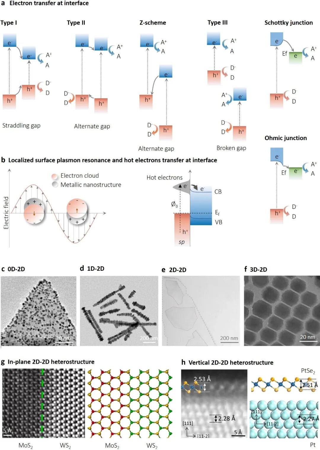 当界面形成时,载流子迁移将表现出很强的方向性。这种强方向性有助于光生载流子的有效分离,从而延长其寿命并提高光量子效率。因此,当我们开始构建基于2D TMDs的异质结界面时,出现了大量提高光催化性能的机会。设计良好的基于二维TMDs的异质结界面应能带匹配、尺寸(几何)匹配和化学相容性。