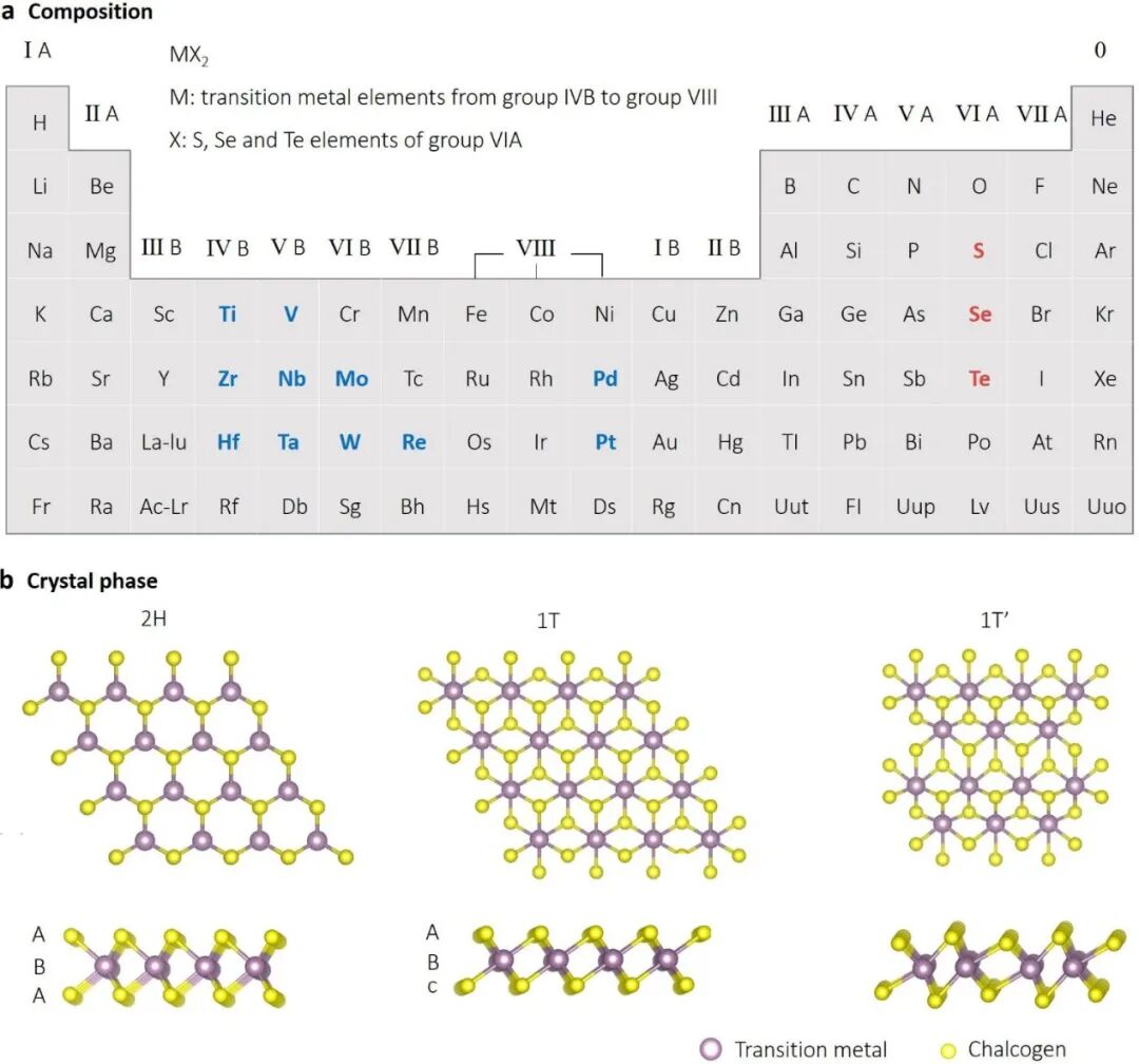TMDs通常标记为MX2,其中M表示IVB族至VIII族的过渡金属元素,X表示VIA族的S、Se和Te元素,如MoS2. TMDs主要包括3种晶相,即2H(三棱柱形)、1T(八面体)和1T′(畸变八面体)。TMD具有可调谐(取决于厚度)的电子带隙,源于量子限域效应。
