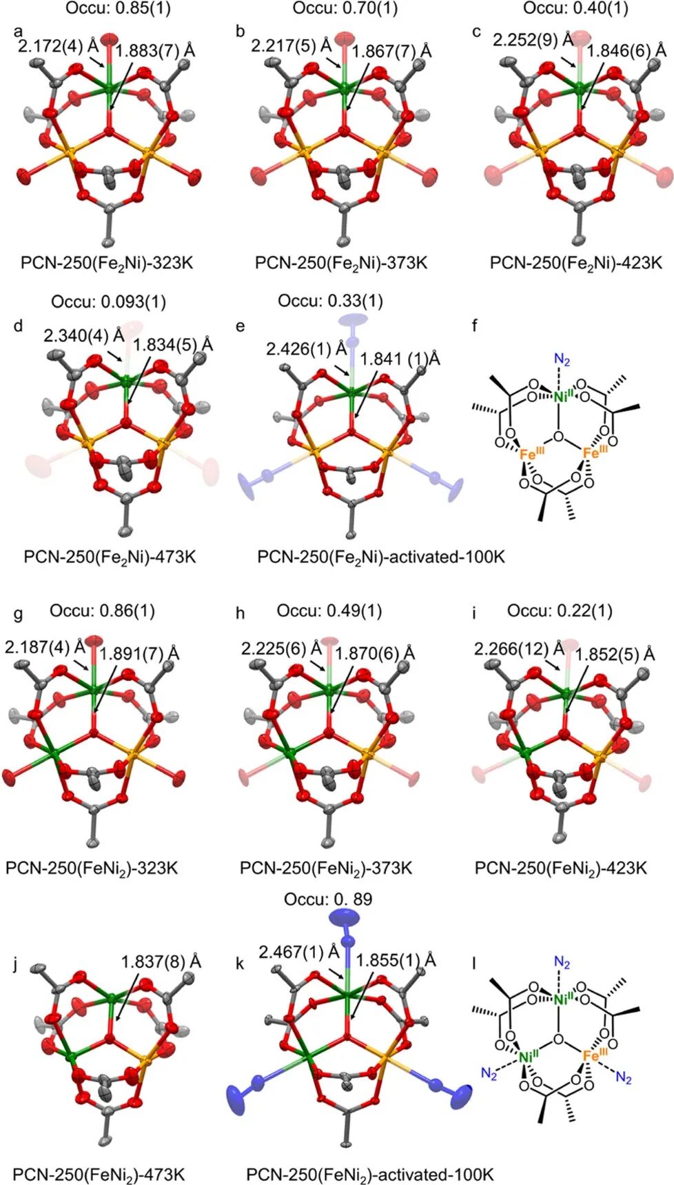 首先合成了不同比例的镍掺杂PCN-250,并通过原位变温单晶测试发现,在相同活化温度下Ni的比例升高引起O端占用率显著降低。有趣的是,当活化的PCN-250(Fe2Ni)在100 K的N2流下冷却时,观察到N2分子与金属位点的结合,这说明二价镍的掺杂能调节临近铁位点的电子结构,改变客体分子的结合能。