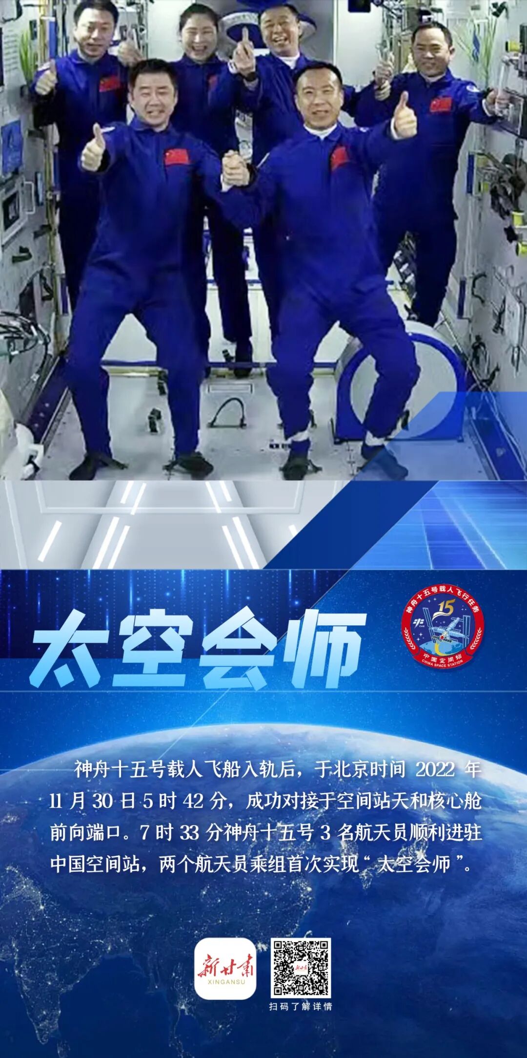 据中国载人航天工程办公室消息,在载人飞船与空间站组合体成功实现自主快速交会对接后,神舟十五号航天员乘组从飞船返回舱进入轨道舱。完成各项准备后,北京时间2022年11月30日7时33分,翘盼已久的神舟十四号航天员乘组顺利打开“家门”,热情欢迎远道而来的亲人入驻“天宫”。随后,“胜利会师”的两个航天员乘组,一起在中国人自己的“太空家园”里留下了一张足以载入史册的太空合影。