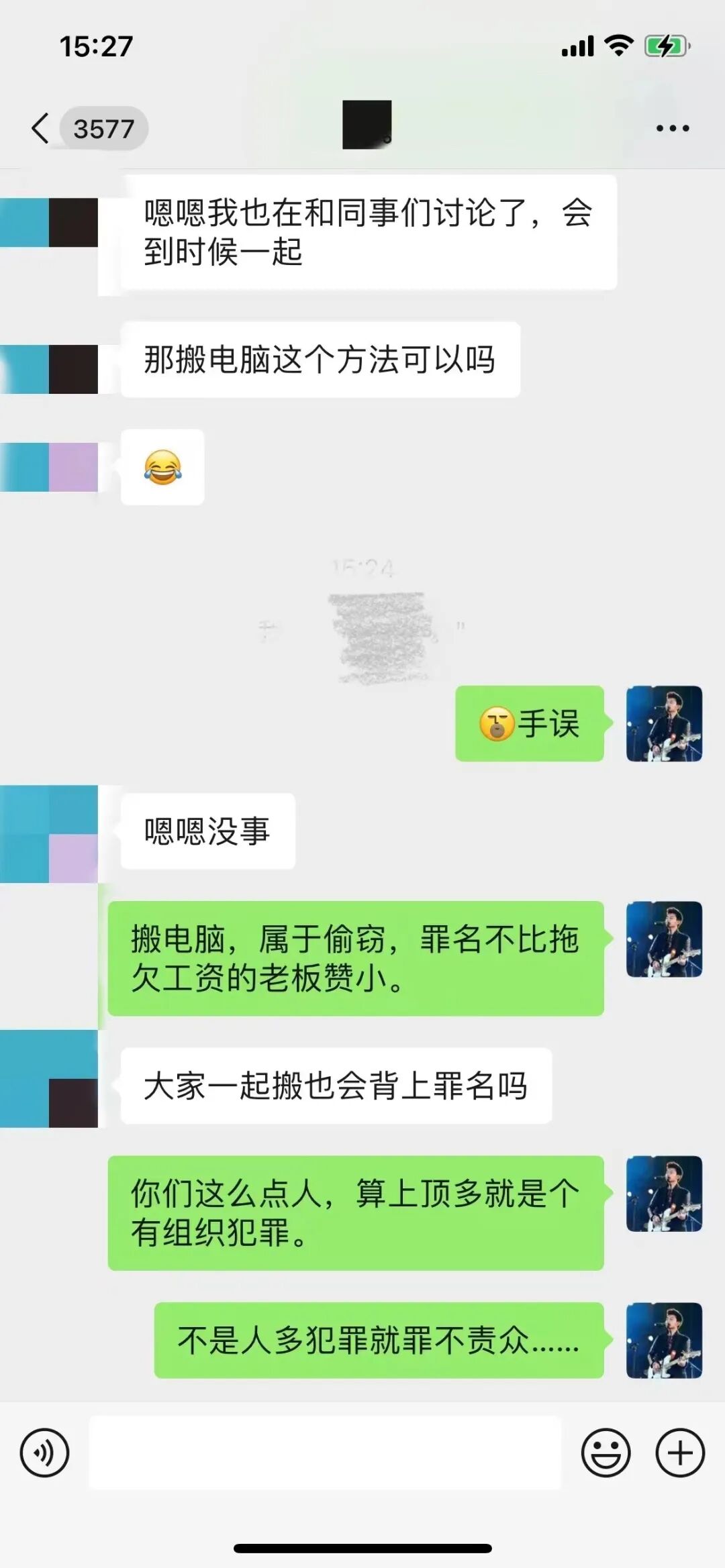 例如这位同学,公司已经不发工资几个月了,同事们之间商讨,要不要搬走公司的电脑作为部分补偿。
