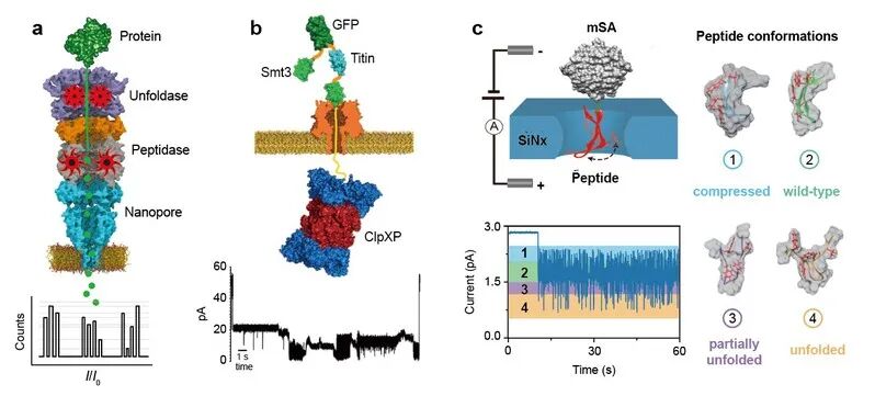 纳米孔道师法自然,模拟细胞膜表面蛋白质通道,其限域空间提供了最逼近实际生命体系中分子反应行为的场所,可实现在极短的时域内捕获单个分子瞬态变化,从而探索基础生物化学领域新现象、新规律和新知识提供可靠的单分子电化学测量方法。早在上世纪90年代,纳米孔道最初作为一种生物传感器开发应用于超灵敏核酸测序和无标记生物小分子的单分子传感测量。经过近30年的发展,纳米孔道单分子电化学分析技术已应用于DNA测序等。在DNA测序以外,近年来其在蛋白质检测与测序、生物化学反应动态测量研究等方面显示出独特的优势。