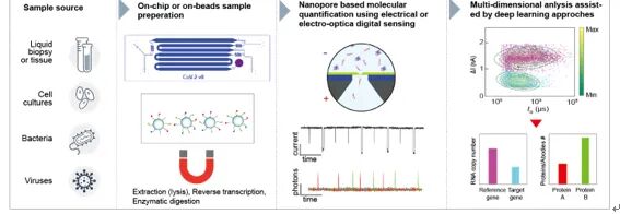 南京大学龙亿涛教授、应佚伦团队长期致力于纳米孔道电化学传感机制与应用研究,积累了十多年的实验实践、理论认知以及仪器开发经验。近日,龙亿涛教授、应佚伦教授团队与国际顶尖纳米孔(道)研究团队梳理回顾了近年来纳米孔道电化学技术在蛋白质分析和测序、单分子共价化学、液体活检临床应用以及仿生纳米孔道系统构建与应用等方面的发展现状和主要挑战,深入探讨了纳米孔道电化学“限域空间效应“为单分子测量技术带来的新机遇、新挑战和新应用。 生物/化学功能化修饰赋予纳米孔道理想的几何尺寸和丰富的界面性质,有助于提高传感灵敏度和选择性,允许纳米孔道从本体溶液中高效地捕获、识别和传输各种分子和离子。在典型的纳米孔道测量中,单个分析物分子在外加电场作用下进入纳米孔道限域空间,扰动离子流动和分布,产生与分析物尺寸、电性、序列等相关的时序电流响应变化。通过解析单分子电信号的电流幅值与波动程度、持续时间和事件频率等特征差异,纳米孔道在单分子水平上实现了包括DNA、RNA、多肽、蛋白质、小分子代谢物及其复合物在内的多种生物分子的随机传感测量和表征。从2004年使用α-溶血素纳米孔道检测多肽开始,纳米孔道技术在蛋白组学研究方面取得了许多重要进展,包括多肽长度与体积表征、多肽/蛋白质翻译后修饰识别与构象变化研究、蛋白质相互作用分析以及酶活性测定。最新研究利用DNA聚合酶或解旋酶控制DNA-多肽复合物单体顺次过孔速度,实现了不超过17个氨基酸长度多肽片段的序列测定,实验验证了纳米孔道蛋白质测序的可行性。图2:(a) 单分子蛋白质识别原理示意图;(b) 基于ClpXP的蛋白质解折叠;(c) 实时监测单分子多肽瞬态构象转换。蛋白质生物纳米孔道具有天然的限域结构,可以作为优秀的纳米级反应器,其限域环境与聚合物单分子反应动力学密切相关,通过改变纳米反应器内空间分离的活性基团的排布可实现化学反应选择性的调控。研究发现,聚合物骨架中的二硫化物与纳米孔道内半胱氨酸的反应强烈依赖于它们在纳米孔道内的相对位置。基于限域化学选择性,在纳米孔道内构建半胱氨酸轨道,通过连续的硫醇-二硫化物交换反应,实现了DNA 单分子机器亚纳米级步长的定向行走。生物/固体纳米孔道、蛋白质工程以及DNA纳米技术的发展,为建造纳米孔道仿生系统解决生物学难题提供了借鉴。经典范例包括:在固体纳米孔道内修饰固有无序FG核孔蛋白(FG-Nups)成功构建了仿生核孔复合物,探究了并证实了FG-Nups网络及其疏水残基对核孔复合物选择性的重要作用;利用可编程的DNA origami作为支架锚定FG-Nups得到仿生核孔复合物,借助显微成像技术研究了受限FG-Nups的空间排列,该平台能够用于进一步探索不同类型FG-Nups形成的复杂度更高的网络。图4:基于固体纳米孔道与DNA origami的仿生核孔复合物构建近几年,纳米孔道技术在临床检测应用方面取得了一系列进展。研究人员尝试将纳米孔道传感器集成到微流控系统中,开发智能分析方法和设备用于临床样品制备和分析物浓缩;设计探针分子与体液样本中的目标分析物特异性结合形成复合物,光电同步测量它们及其复合物的信号响应差异;在生物纳米孔道(如OmpG、t-FhuA孔道)孔口处连接一个抗体或蛋白受体诱捕目标蛋白研究两者结合/解离动力学,或者在孔道内装配一个底物结合蛋白检测体液样本中葡萄糖、维生素B1等代谢物小分子的浓度。此外,通过选择性降解背景分子增强检测特异性同时规避对纳米孔道结构功能的负面影响,最近报道了一种纳米孔道数字计数方法,使用酶降解寡聚核苷酸探针与mRNA生物标志物结合后的背景分子,无需纯化和PCR扩增,实现了临床样本中SARS-CoV-2冠状病毒的准确测量。未来纳米孔道单分子电化学分析技术的发展仍面临诸多机遇与挑战,本文探讨和展望了孔道构建、蛋白质分析、单分子化学、信息存储以及生物医药与临床诊疗等方面的应用,主要包括:生物、固体纳米孔道的天然/非天然基团可控修饰;蛋白质纳米孔道从头设计和DNA origami纳米孔道定制合成;构建合适的纳米孔道限域环境精确控制单分子化学反应进程有望用于高效合成;开发大规模集成化便携式纳米孔道仪器系统提高传感精度、时间分辨率和检测效率,可实现准确快速揭示单分子聚合物(如蛋白质、多糖和脂类)的确切组成和单体序列,从而发展用于个体精准诊疗纳米孔道单分子体外诊断技术。 相关内容以“Nanopore-based technologies beyond DNA sequencing”为题发表在Nature Nanotechnology (2022, DOI: 10.1038/s41565-022-01193-2)上,应佚伦教授、胡正利副研究员为论文共同第一作者,南京大学为第一完成和通讯联络单位,牛津大学Hagan Bayley教授、代尔夫特理工大学Cees Dekker教授、以色列理工学院Amit Meller教授、格罗宁根大学Giovanni Maglia教授和南京大学龙亿涛教授为共同通讯作者,该工作得到了国家自然科学基金(22027806, 21922405, 22106066)等支持。文章连接为: