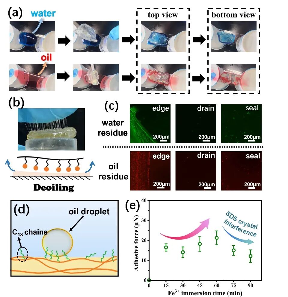 相对于常见的水下湿粘附水凝胶,经过调节后的亲、疏水聚合物链P(AAm-co-C18)/PTA-Fe水凝胶实现了油下、水下的通用黏附。具体为,在水环境中表面的疏水聚合物链排出了黏附界面的水层,通过与粗糙基底表面的机械互锁和黏附基团界面作用,最终完成了水下黏附。同理,在油或有机试剂的环境中,表面的亲水聚合物链起到了排油的作用。P(AAm-co-C18)/PTA-Fe水凝胶能用于油、水环境中的紧急漏液处理。