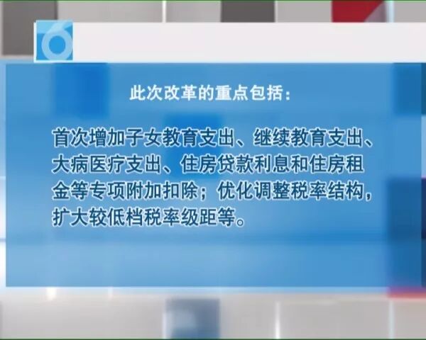 此次改革的重点包括:工资薪金、劳务报酬、稿酬和特许权使用费等四项劳动性所得首次实行综合征税;个税起征点由每月3500元提高至每月5000元,也就是每年6万元起征;首次增加子女教育支出、继续教育支出、大病医疗支出、住房贷款利息和住房租金等专项附加扣除;优化调整税率结构,扩大较低档税率级距等。得知个税起征点上调,不少月收入在五千元以下的市民欣喜不已。