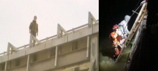 市民:“就在那里一晃一晃的,只看到一个人影,说什么也听不见 ,下面有消防气垫,他那个动作, 一会儿站 、一会儿躺,反正就在那里活动。”