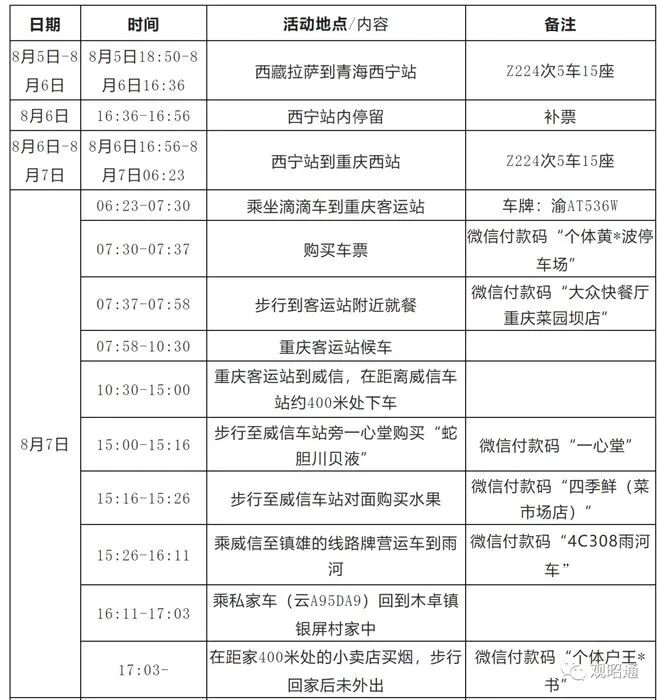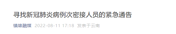 2022年8月11日,根据四川省德阳市旌阳区疾控中心推送的协查信息,镇雄籍兰某靖、彭某锦与新冠肺炎病例接触,被判定为密切接触者,目前2人已在我县集中隔离医学观察。按照疫情防控相关要求,现将2人主要活动轨迹通告如下: