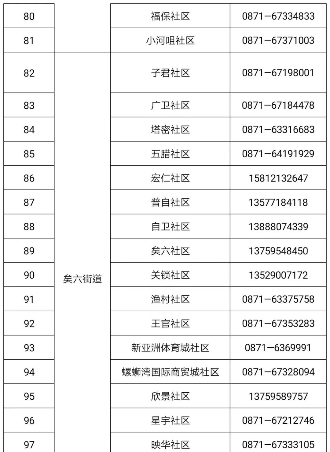 社区 | 拓东街道 | 明通巷 社区 | 0871-63187832 | 13618718537 | 08:00 -20:00 |