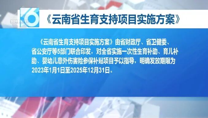 《云南省生育支持项目实施方案》由省财政厅、省卫健委、省公安厅等5部门联合印发,对全省实施一次性生育补助、育儿补助、婴幼儿意外伤害险参保补贴项目予以指导,明确发放期限为2023年1月1日至2025年12月31日。