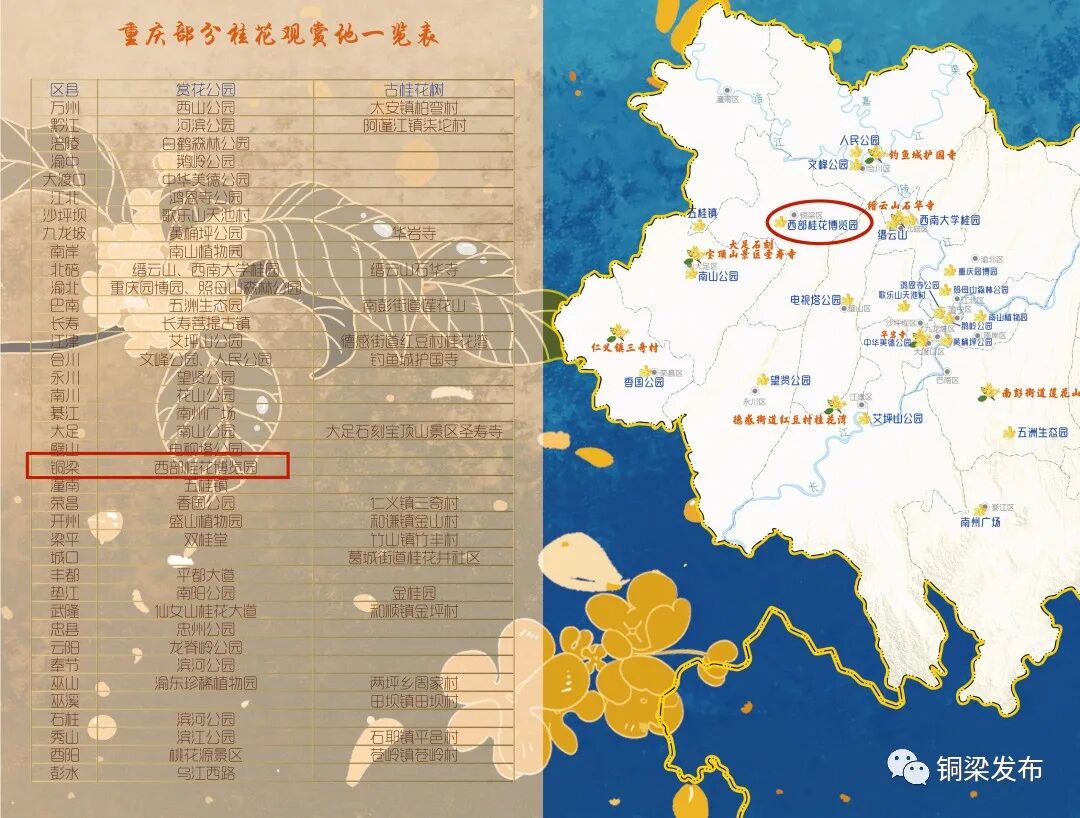 日前,重庆市规划和自然资源局、市地理信息和遥感应用中心发布了《重庆桂花地图》,铜梁的桂花博览园榜上有名。
