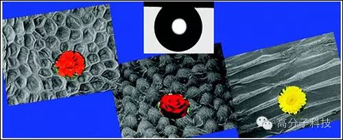 红玫瑰花瓣表面具有层状的微乳突和纳米褶皱,这些微纳结构为超疏水性提供了足够的粗糙度,同时也产生了对水的高粘附力。花瓣上的水滴呈现出球形,但将花瓣颠倒后却不易滚落。作者把这种现象称为“花瓣”效应,可与著名的“莲花”效应类比。作者通过对花瓣表面的模仿,使人工生产的仿生聚合物薄膜表面也具有了清晰的纳米压花结构。
