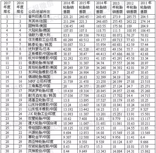 2017年全球轮胎制造商前20强排名