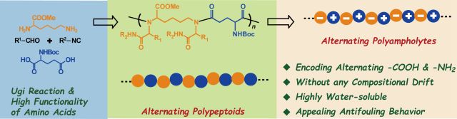 中科院长春应化所陶友华研究员课题组自2013年开始从事氨基酸聚合新方法的研究。在前期的工作中,他们发展了氨基酸Ugi多组分聚合新方法,实现了高分子量聚类肽温和、高效及规模化的合成。在此基础上,他们充分利用氨基酸单体具有多官能团性的特点,以赖氨酸、谷氨酸作为 AA、BB 型单体,基于 Ugi 多组分聚合,成功合成了高分子量(M n >15000)的交替序列聚类肽。特别地,将所合成的聚类肽侧基上的羧基的甲酯保护基和氨基的 Boc 保护基脱除,即可得到侧基为氨基和羧基交替的两性聚类肽。这种交替序列的两性聚类肽具有很好的抗蛋白污染性能。因此,这项研究工作也为合成正负电荷交替排列的聚两性电解质提供了一种新的策略。