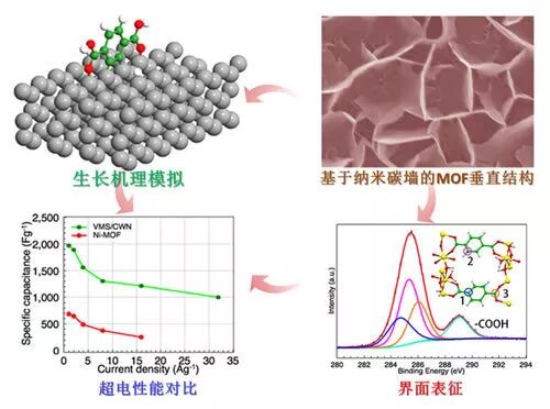 在Communications Chemistry最近发表的研究Vertically co-oriented two dimensional metal-organic frameworks for packaging enhanced supercapacitive performance中,吉林大学郑伟涛教授、张伟教授和邓霆博士等以等离子体增强化学气相沉积法制备的纳米碳墙作为模板和集流体,与 MOF的前驱体结合成功地合成出了具有垂直结构的二维MOF材料。通过第一性原理对MOF的生长机理进行了计算模拟,发现合成MOF的前驱体吸附在碳墙的边缘并沿着边缘生长,金属离子与有机配体继续沿着平行于碳墙的方向进行自组装,最后形成了具有垂直结构的MOF。