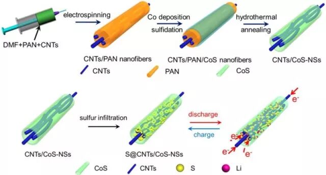 通过对样品进行表征分析,课题组认为锂硫电池的良好的电化学性能主要来源于以下几个方面:(1)管状空心结构可以负载较多的硫活性成分,并且能显著的缓解硫在电化学过程中的体积膨胀;(2)CoS和碳纳米管的高导电性可以提高硫正极的电子导电性并且增加活性硫组分的利用率;(3)CoS具有较高的化学吸附作用,能够与多硫化锂中间体结合,抑制其溶解与穿梭效应的发生;(4)CoS对多硫化锂的转换具有很高的电催化效应,催化多硫化锂的快速转化;(5)管状材料的强毛细作用力能够有效的保持电解液,使得电解液与活性组分充分的接触。