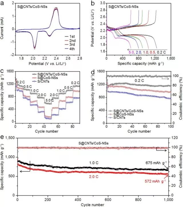 图3. S@CNTs/CoS-NSs电极在0.2 mV s-1扫速下的CV曲线;(b)S@CNTs/CoS-NSs电极在不同电流密度下的充放电曲线; S@CNTs/CoS-NSs与对照电极的(c)倍率性能和(d)0.2 C下的循环稳定性;(e)S@CNTs/CoS-NSs电极在1.0和2.0 C下的长循环稳定性与库伦效率。