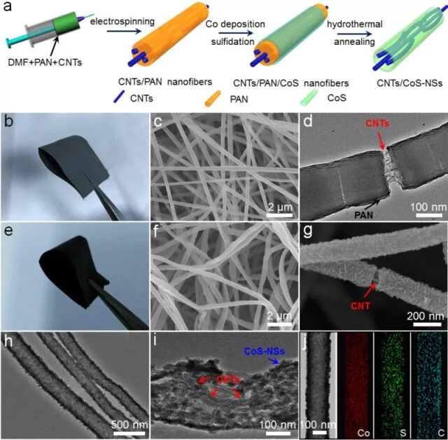 图1. (a)CNTs/CoS-NSs的合成示意图;(b-d)CNTs/PAN的电子照片,SEM,TEM图像;(e-i)CNTs/CoS-NSs的电子照片,SEM,TEM图像;(j)S@CNTs/CoS-NSs的元素mapping。