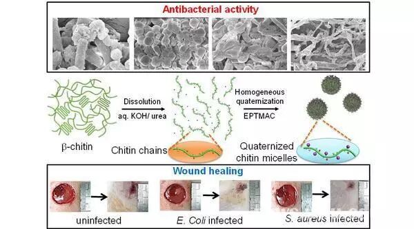 与文献中已报道的其它抗菌材料相比,季铵化β-甲壳素有着优异的广谱抗菌性,其抗菌活性与肽多糖相当,并且具有良好的细胞相容性和血液相容性。动物实验中,季铵化β-甲壳素衍生物在非感染伤口及细菌感染伤口治愈过程中有明显促愈合作用,有望用作伤口感染治疗的抗菌材料。