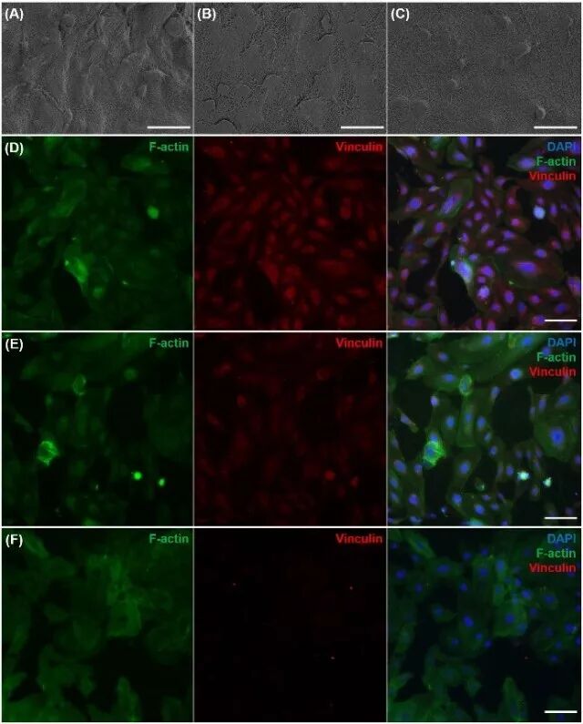 图2. 血管内皮细胞在不同复合支架上的细胞黏附和黏着斑形成情况。(A, D)高活性低弹性支架;(B, E)中活性中弹性支架;(C, F)低活性高弹性支架