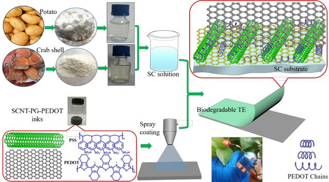 该论文提出了一种通过引入导电聚合物聚(3,4-乙撑二氧噻吩)作为碳纳米管/石墨烯的有机界面粘合剂和导电连接剂,构建三维互通导电网络的方法,并将导电网络嵌入到由天然蟹壳与马铃薯衍生得到的柔性基底中,制备出高性能石墨烯基导电薄膜,有望用于可穿戴智能电子纺织服装中。该论文第一作者为博士研究生苗锦雷,通讯作者为张兴祥教授。
