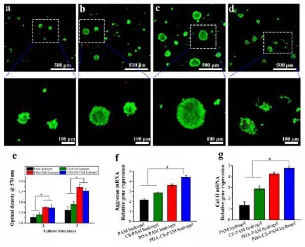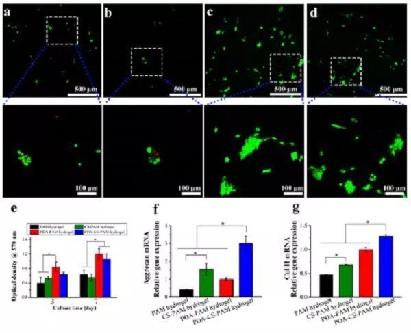 软骨细胞在不同水凝胶表面培养 21 天后蛋白多糖(f)和 II 型胶原的表达量(g)