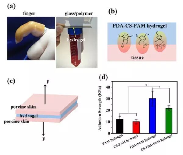 (e)PDA−CS−PAM 水凝胶中的PDA组分有利于生长因子的固定与细胞的粘附,从而使CS发挥其生物学功能。
