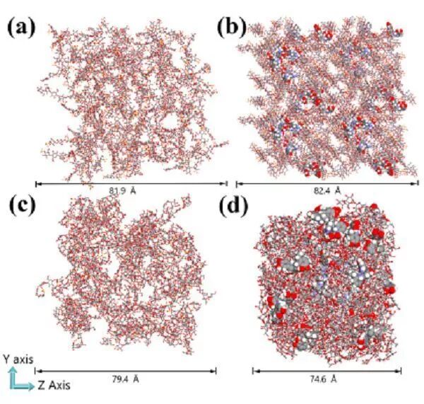 (d)CS-PDA 复合物形成紧密的结构,说明PDA与CS存在较强相互作用,能够形成纳米结构。图中,CS显示为棍状模型,PDA为球状模型。