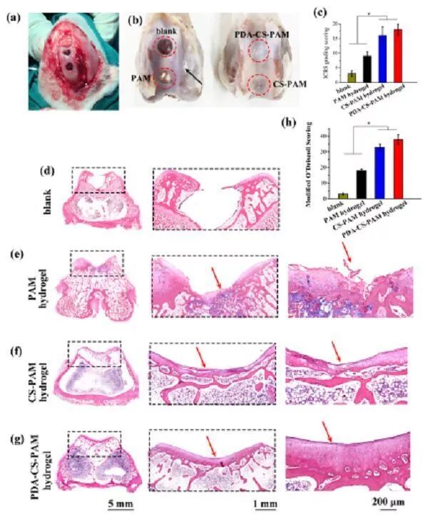 (d-g)各组术后 6 周的 H&E染色分析,(d)空白对照组,(e)PAM 水凝胶处理组,(f)CS-PAM 水凝胶处理组,(g)PDA-CS-PAM 水凝胶处理组