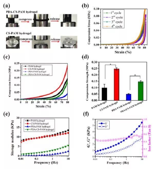 (c-d)PAM, CS-PAM, PDA-PAM,以及PDA-CS-PAM水凝胶的压缩曲线和压缩强度。