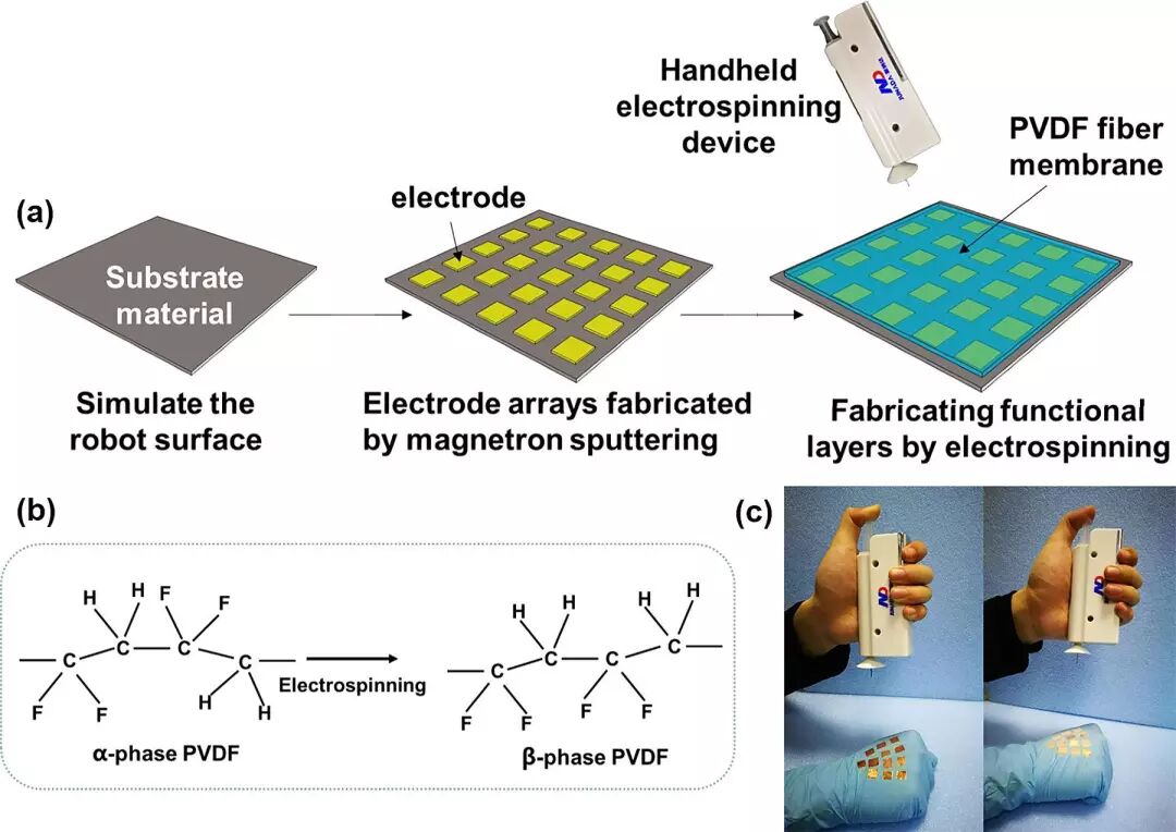 图1.制作单电极电子皮肤。(a)制造工艺流程。(b)静电纺丝过程中PVDF分子结构的变化。(c)使用手持式静电纺丝装置制造电子皮肤的过程的照片。