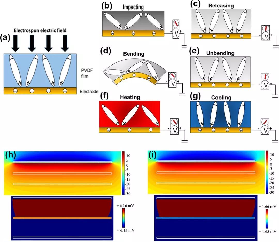 图3.单电极皮肤的工作机制。(a) 电子皮肤的结构和原理。(b,c) 当装置施加冲击和释放应变时,由于压电效应引起的电信号。(d,e) 应用弯曲和不弯曲时的装置,由于压电效应引起的电信号。(f,g) 由于加热和冷却时器件的热电效应引起的电信号。(h,i) 计算电偶极子变化前后的电位分布。