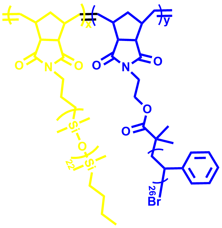 嵌段共聚物可以自组装得到丰富的纳米结构,在光子晶体、太阳能电池、纳米反应器、刺激响应材料、纳米光刻等方面具有广泛的应用前景。目前,研究较多的是线性嵌段共聚物的自组装。对于线性嵌段共聚物,其组装尺寸一般在10-100nm之间,难以得到更大尺寸的组装结构,从而限制了其应用。以聚降冰片烯为主链的嵌段共聚物刷可以得到超过100 nm的组装结构,但目前对于侧链不对称的嵌段共聚物刷的组装形貌还缺乏系统研究,此外,嵌段共聚物刷大多通过“grafting from”的方式制备,接枝不完全,无法精确解释相转变。