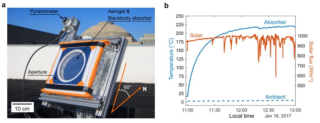 图3. (a) 气凝胶太阳能光热收集装置户外试验照片(地点:麻省理工学院楼顶平台),(b) 试验过程中太阳能吸收板温度,环境温度和太阳辐射强度数据