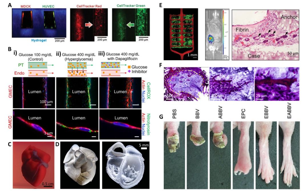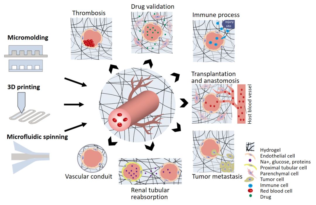 组织工程是一门旨在实现体外仿生组织构建的多领域交叉学科。血管是所有器官系统最重要的特征之一。血管系统分布在全身各处,负责运输氧气、营养物质、生长因子和细胞,并清除废物。因为扩散限制,体内细胞多存在于距离血管小于200 µm的范围内,并与体内众多生理和病理过程息息相关。因此,开发仿生血管构建技术是构建仿生器官模型和工程化组织的关键。