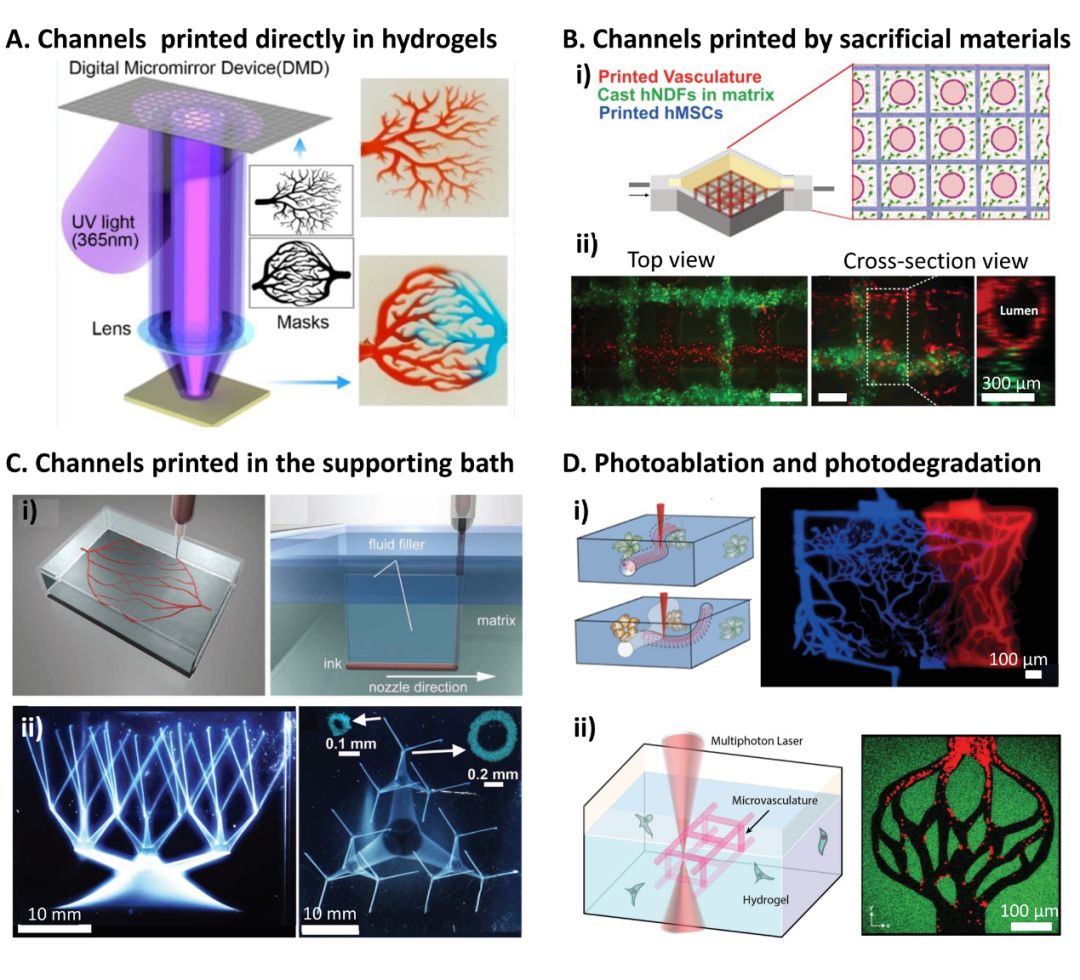图1.水凝胶内微通道制备技术及可灌注水凝胶的生物医学应用。
