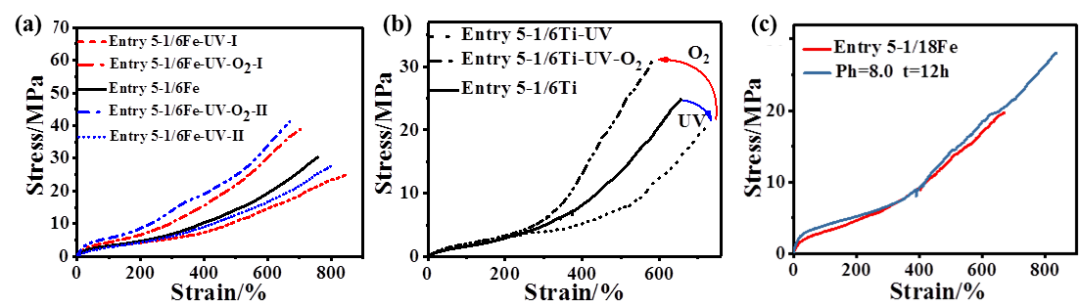柠檬酸在紫外下发生脱羧反应可将Fe3+ 还原为Fe2+,从而降低交联密度。此外,Fe2+ 部分可以很容易地通过在空气中加热氧化回Fe3+ 状态,进而增加交联密度,实现过程的可逆。在这一循环中,由于羧基官能团浓度的降低,最终状态下的交联密度高于原始状态,从而提升了聚合物的机械性能。如图4所示,样品Entry 5-1/6-Fe暴露在紫外线下10分钟后,拉伸强度值降低了约20%,由30.5降到到24.3 Mpa;在空气中进行热处理后,拉伸强度值增长到39.0 MPa。更为重要的是这一循环可多次进行,同时这一策略也可用于Ti4+ 等金属离子。