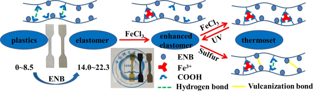 图3. 通过调节ENB含量、引入氢键、Fe3+离子、硫交联键的作用来调节材料性能。