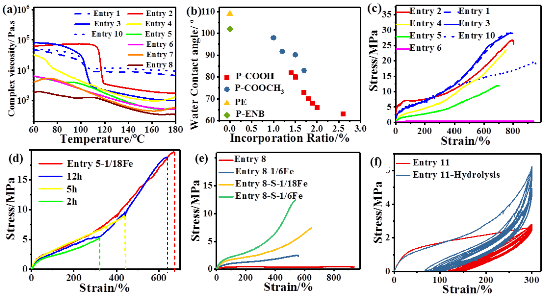 这类材料具有优异的表面性质、加工性能、物理机械性能和自修复性能。其水接触角可低至63°,极大地改善了聚烯烃材料的表面性质。拉伸应力为0.4至26.7 MPa,断裂伸长率为700%至940%,涵盖通用塑料和弹性体材料的应用范围。由于氢键、铁离子和硫交联键的作用,可进一步制备热固性功能聚烯烃材料,由于铁离子和硫交联键的作用,拉伸强度可分别提高5.7和7倍。