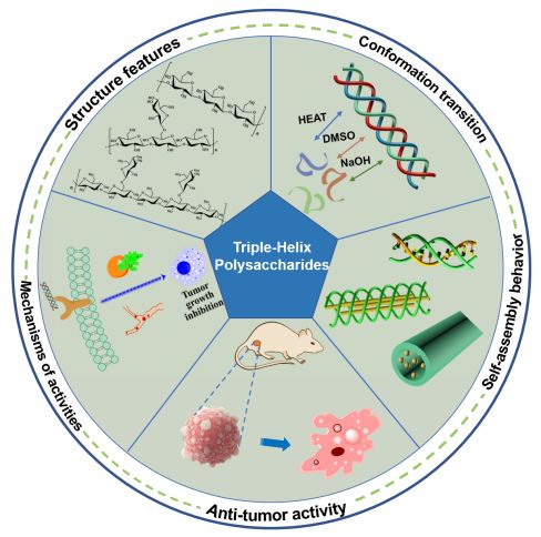 他们首次发现香菇和黑木耳中含有三螺旋链葡聚糖,并证明存在独特三螺旋结构,且表现出多种生物活性以及自组装行为。由此,他们制备出一系列具有载药、成像、抗肿瘤等功能的多糖基纳米复合物。他们在这篇综述中从结构和功能两个方面对三螺旋多糖的最新研究进展进行了总结,着重阐述了香菇多糖、裂褶菌多糖、黑木耳多糖、凝胶多糖的三螺旋链构象及其确定方法、结构特点、三螺旋链结构的破坏和重组、聚集/组装行为及其作为基因、药物、纳米粒子、成像试剂等载体递送功能,以及生物活性及构效关系。近年的这些研究成果表明三螺旋多糖具有优良的生物活性、安全性和生物降解性,是理想的天然药物和营养保健产品。然而,三螺旋多糖在临床应用中仍面临挑战,需要进一步研究它们的分子生物学、生物活性机理及信号通路,以及大量动物试验和临床试验,才能开发出高效、高选择性的天然药物和营养保健产品。