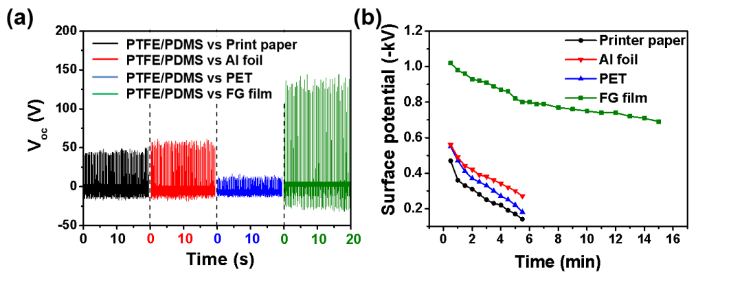 图2:鱼明胶薄膜与其他常用材料制备的摩擦纳米发电机性能的比较