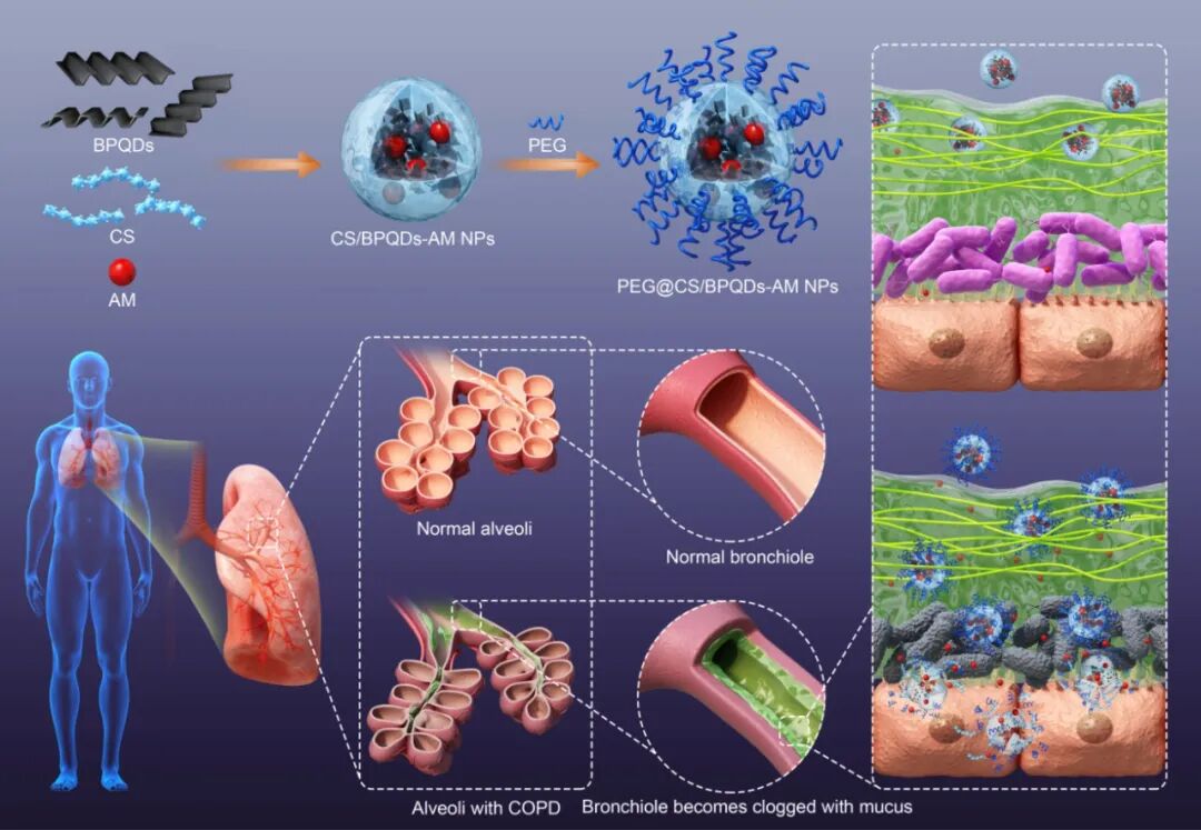 黑磷量子点介导的纳米药物控释载体(PEG@CS/BPQDs-AM NPs)制备过程及其穿透慢阻肺粘液屏障递送药物治疗示意图