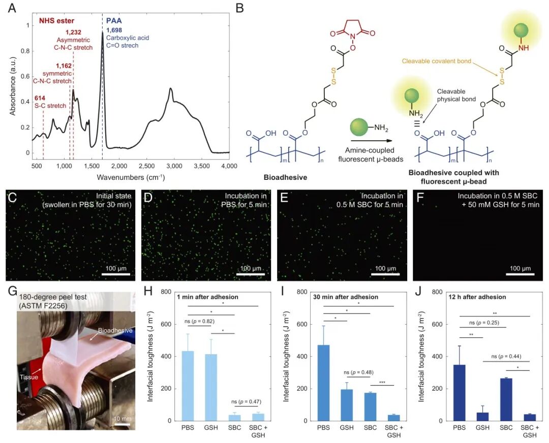 为了裂解共价交联,通过合成功能单体在NHS酯基和PAA网络之间引入可裂解的二硫键。在引入生物相容性还原剂(如GSH)后,GSH中的侧巯基可在生理条件下将生物粘附物中的二硫键断裂为硫醇基,从而切断生物粘附物与组织表面之间的共价交联(图1C)。