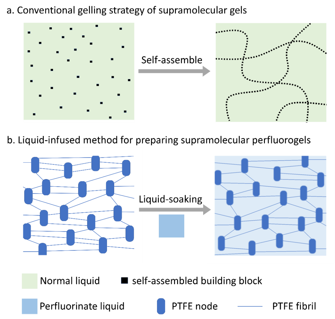 全氟凝胶由于其特殊的表面性能(超低表面能、超疏水性),开始受到相关领域研究人员的关注。然而,由于全氟聚合物具有化学稳定性和难以溶剂化的特性,目前尚无简单有效的方法可用于制备兼具优异机械性能和特殊表面性能的超分子全氟凝胶。近日,电子科技大学崔家喜教授团队报道了一种利用多孔聚四氟乙烯(pPTFE)的纤维网络固定各种全氟化液体来制备超分子全氟凝胶的方法。与常规超分子凝胶通过自组装凝胶化不同的是,该项工作采用全氟试剂浸泡多孔聚四氟乙烯的方式得到了全氟超分子凝胶(图一)。