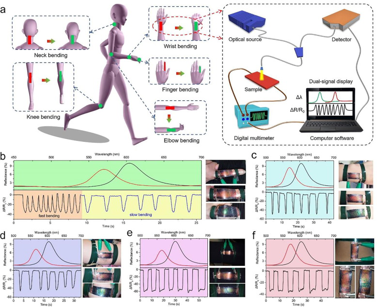 最后,考虑到MET传感器对外界应变具有同步稳定的光电双信号响应,他们进一步将它作为一种新型的可视化交互装置,其中颜色变化可由人眼直接感知并通过光谱进行量化,电信号变化可由电子仪器准确记录,从而实现了对人体各种关节运动的交互式、可视化、动态实时监测,为基于导电织物的可视化交互传感器的实现开辟了道路。