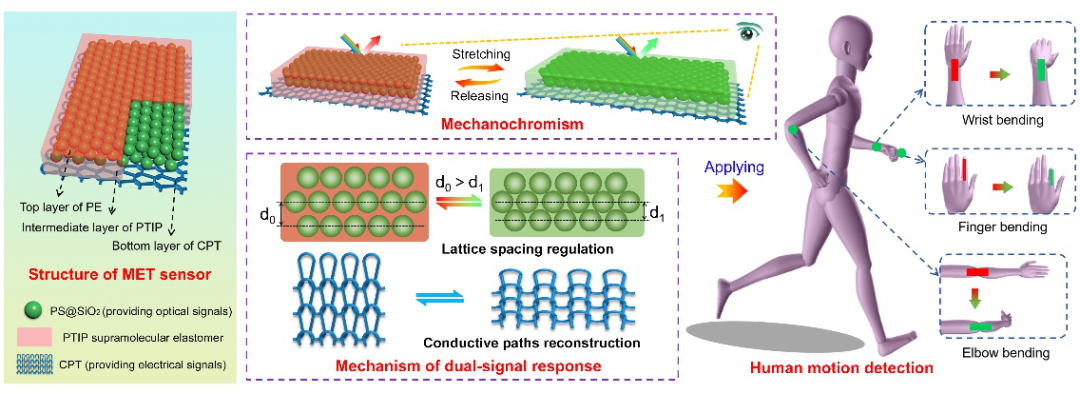 有鉴于此,大连理工大学牛文斌、张淑芬教授等和加州大学洛杉矶分校的材料科学与工程系贺曦敏教授合作,将超分子光子弹性体和具有多层纤维结构的导电涤纶织物结合起来,合作开发设计并制备了一系列具有快速和持久的光电双响应的交互力致变色电子织物(MET)传感器,并进一步展示了它们在可视化可穿戴电子产品中的应用。